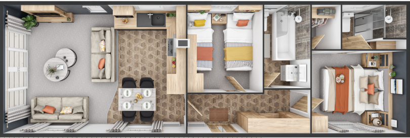 Beverley Norwood-Blue Lodge NEW This Beverley Norwood-Blue is thoughtfully designed to exude a sense of understated luxury, making it the perfect retreat for those who value quality and elegance. Sleeps Size 42ft x 14ft Park Oakwood Valley Lodges Key features Open plan living spaceHallway with bench & coat hooksIntegrated dishwasher & washing machineFeature backlit fireplaceDouble glazed & central heatingResidential SpecificationLarge wraparound decking and skirting included Description With a sophisticated blend of greys, oak finishes and navy blue feature walls, the Beverley Norwood strikes the perfect balance between neutral tones and stylish flair. Its thoughtfully designed interiors exude a sense of understated luxury, making it the perfect retreat for those who value quality and elegance. Upon entering the Norwood, guests are welcomed by a convenient bench seat equipped with coat hooks, ideal for removing shoes and storing outerwear. The open-plan living area features a well-appointed kitchen, complete with an integrated microwave, fridge/freezer, 4-burner gas hob, electric oven and grill, as well as ample storage space. This area is further enhanced by the inclusion of an integrated washing machine and dishwasher, ensuring convenience and efficiency. The dining area is furnished with a robust wooden table and comfortable seating for four, creating an inviting space for meals and gatherings. The lounge area is designed for relaxation, featuring two free-standing sofas, a nest of two coffee tables, and a striking backlit fireplace that fosters a warm and welcoming ambiance. The master bedroom is a sanctuary of comfort, boasting a king-sized bed, a walk-in wardrobe, a fitted wardrobe, and an en-suite shower room complete with a WC, hand basin, and practical integrated shelving. The spacious twin bedroom offers generous over-bed storage and a fitted wardrobe for added convenience. The family bathroom is thoughtfully designed, featuring a bath with an overhead shower, a WC, a hand basin with storage, and a heated towel rail, providing all the essential amenities for a comfortable stay. Large wrap around decking to be installed within the price, to make the most of your countryside surroundings.