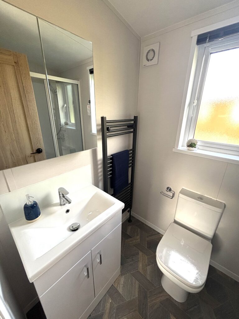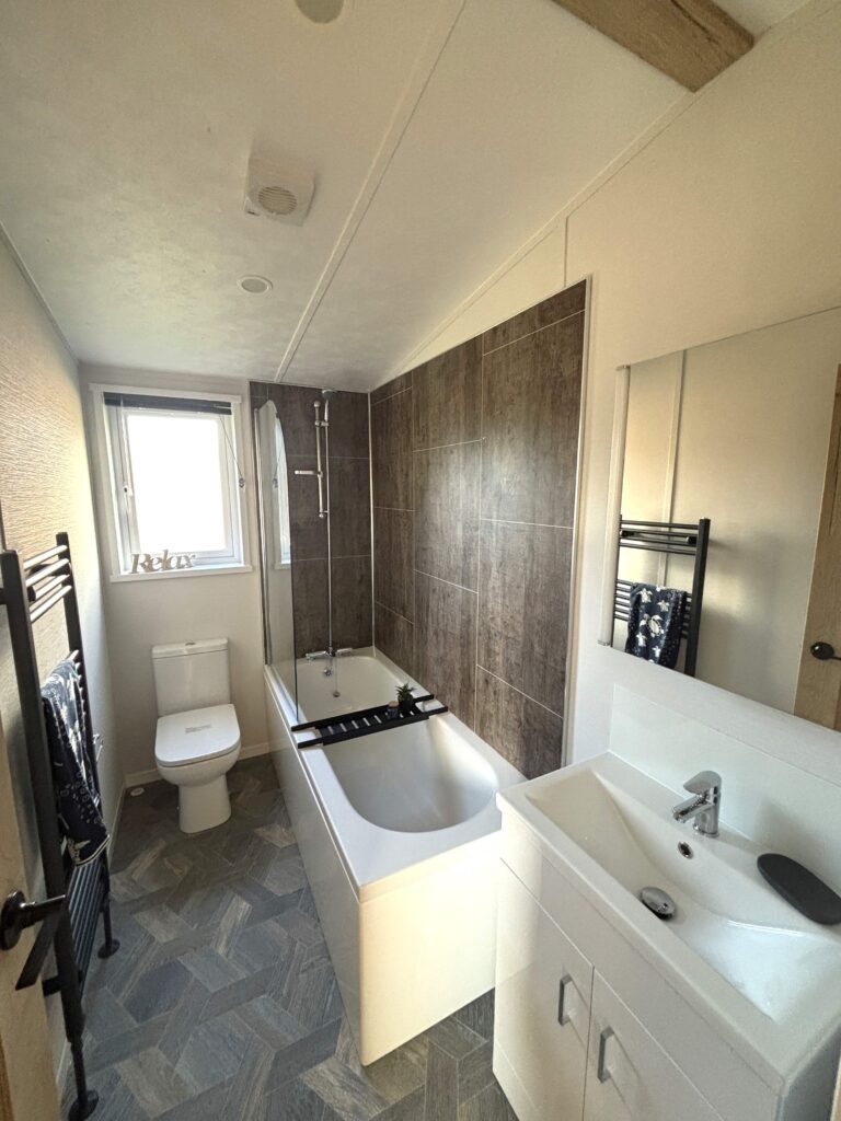 The family bathroom is thoughtfully designed, featuring a bath with an overhead shower, a WC, a hand basin with storage, and a heated towel rail, providing all the essential amenities for a comfortable stay.