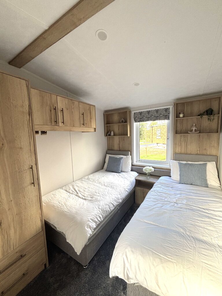 The master bedroom is a sanctuary of comfort, boasting a king-sized bed, a walk-in wardrobe, a fitted wardrobe, and an en-suite shower room complete with a WC, hand basin, and practical integrated shelving. The spacious twin bedroom offers generous over-bed storage and a fitted wardrobe for added convenience.