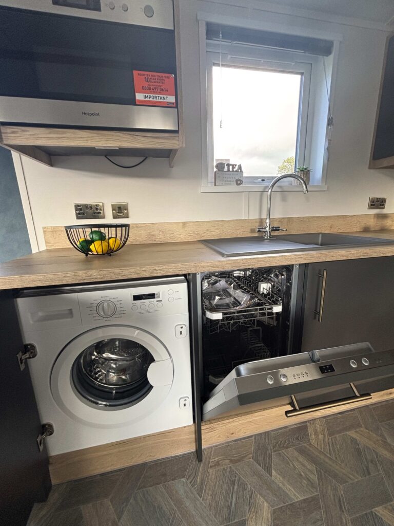 The open-plan living area features a well-appointed kitchen, complete with an integrated microwave, fridge/freezer, 4-burner gas hob, electric oven and grill, as well as ample storage space. This area is further enhanced by the inclusion of an integrated washing machine and dishwasher, ensuring convenience and efficiency.