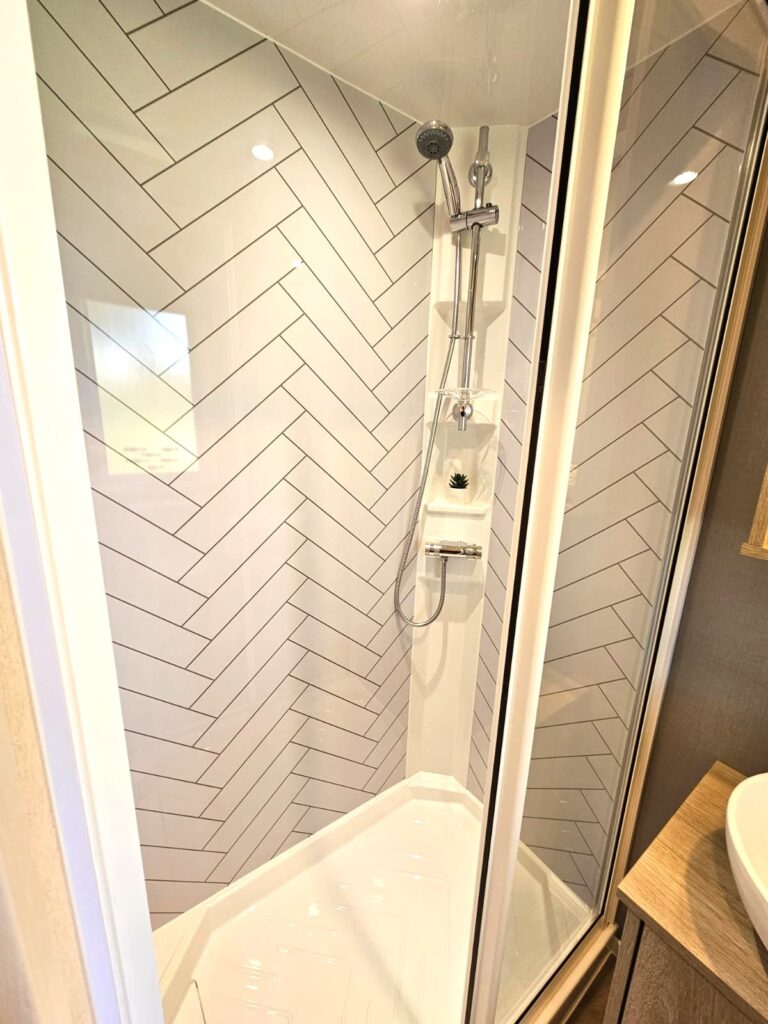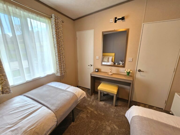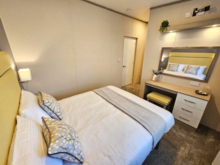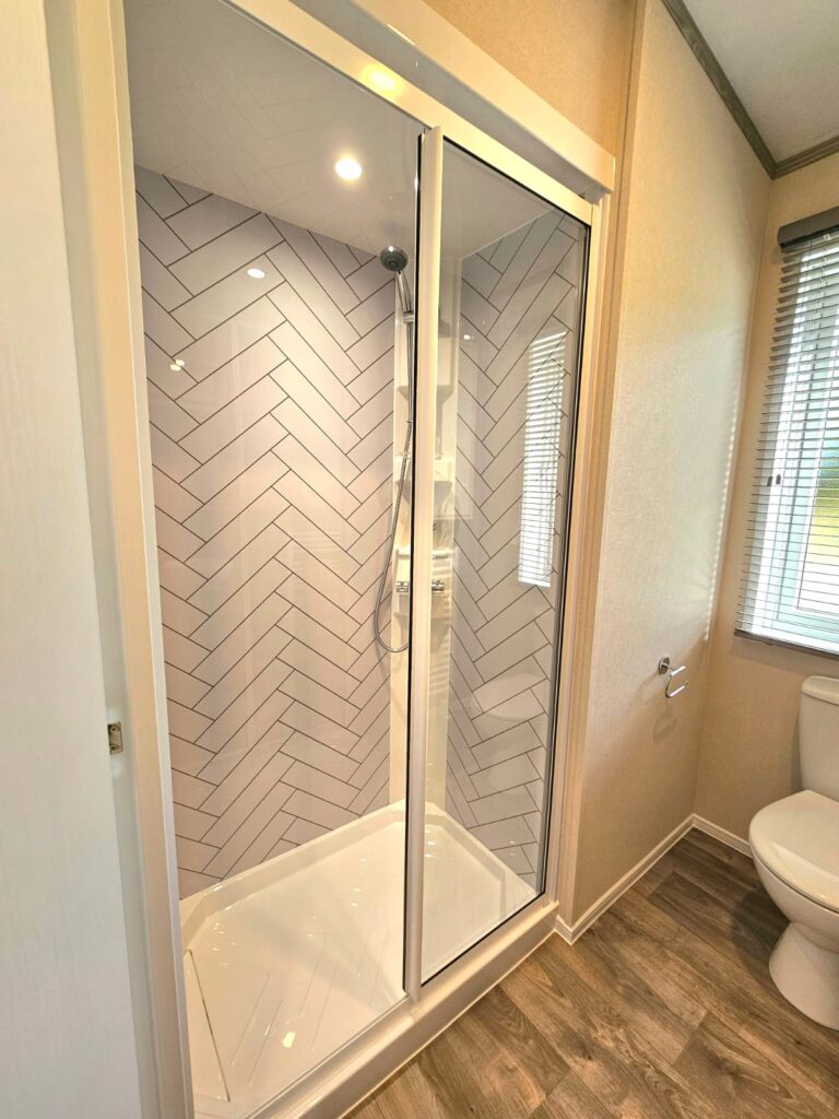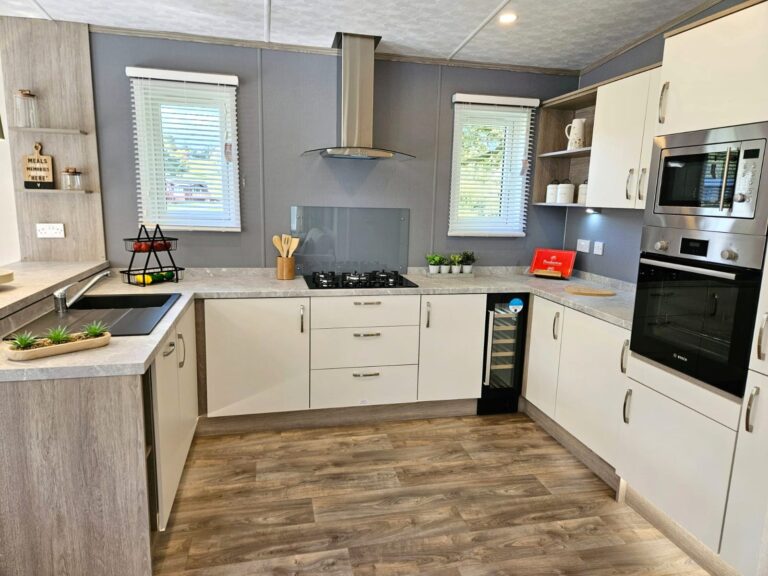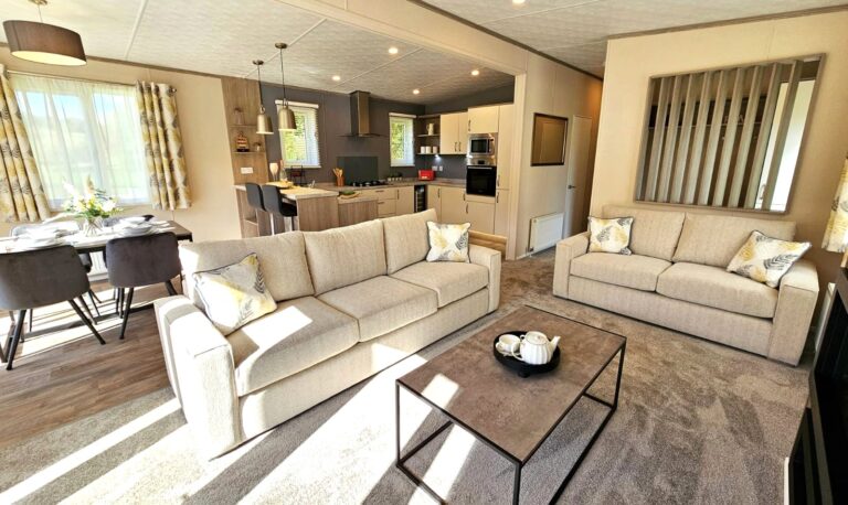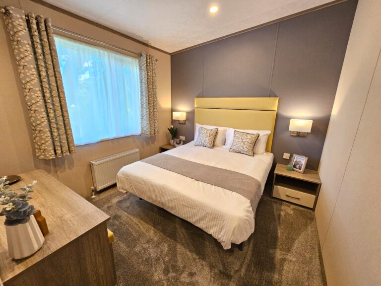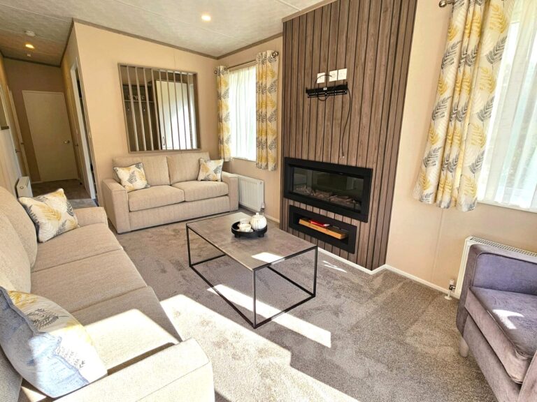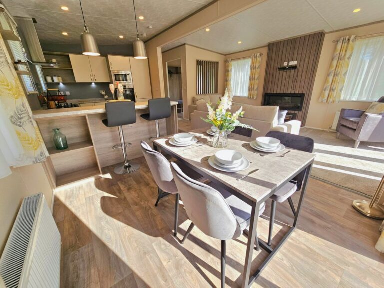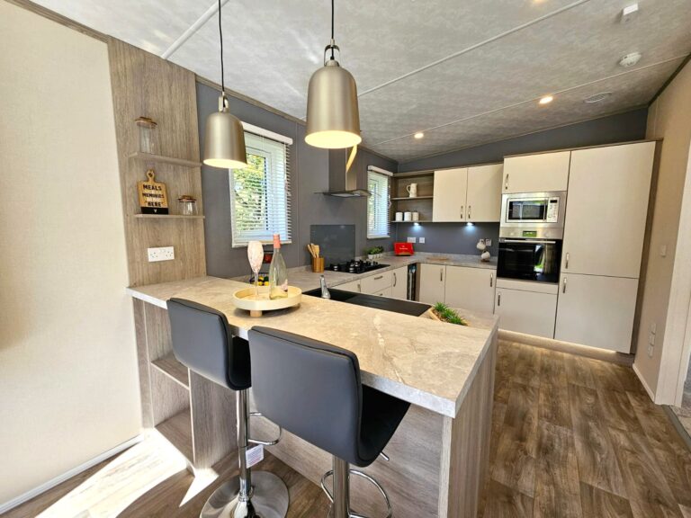 Pemberton Skydale Lodge NEW The Pemberton Skydale exudes character and charm, featuring an open-plan layout that facilitates a seamless flow between social spaces. Sleeps Size 40ft x 20ft Park Oakwood Valley Lodges Key features Open plan living spaceResidential specificationDouble glazed & central heatingIntegrated appliances - washer/dryer, microwave & dishwasherBreakfast bar with 2 stoolsWine coolerHive thermostatMaster bedroom with en-suite & walk-in wardrobeFully skirted and spacious front decking included Description The Pemberton Skydale exudes character and charm, featuring an open-plan layout that facilitates a seamless flow between social spaces. Upon entering the lodge, guests are greeted by a generous bench seat complemented by shelving and coat hooks, providing both functionality and style. The lounge area is furnished with a spacious freestanding three-seater sofa, a sofa bed, and an accent chair, all centred around a striking feature wall that houses an electric fireplace. A coffee table, designed to match the dining table, enhances the cohesive aesthetic of the space. The expansive U-shaped kitchen offers ample room for food preparation and storage, equipped with a five-burner gas hob, oven/grill, microwave, and fridge/freezer. Additional conveniences include an integrated dishwasher and washer/dryer. The stylish breakfast bar provides extra seating for guests, creating a casual dining option. Plinth lighting and under-cupboard spotlights contribute to a warm and inviting ambiance during the evenings. The dining area features a freestanding table that introduces an industrial style element, comfortably seating four. The spacious master king-sized bedroom is complete with a large vanity unit, bedside tables with overhead lighting, and an expansive walk-in wardrobe that includes hanging space, shelving, and drawers. The en-suite bathroom is equipped with a shower, WC, hand basin with under-sink storage, a mirror, a heated towel rail, and a storage cabinet. The twin bedroom is adorned with striking fabric headboards, bedside tables, a vanity unit, and a walk-in wardrobe featuring a set of drawers. The main bathroom offers a spacious shower, WC, hand basin with under-sink storage, a heated towel rail, a mirror, and a storage cabinet. The Skydale is enhanced by large front windows and French doors that invite an abundance of natural light, creating a bright and airy atmosphere. The French doors open onto a generous front decking area, allowing you to fully embrace your surroundings. Please note the skirting and decking is due for installation.
