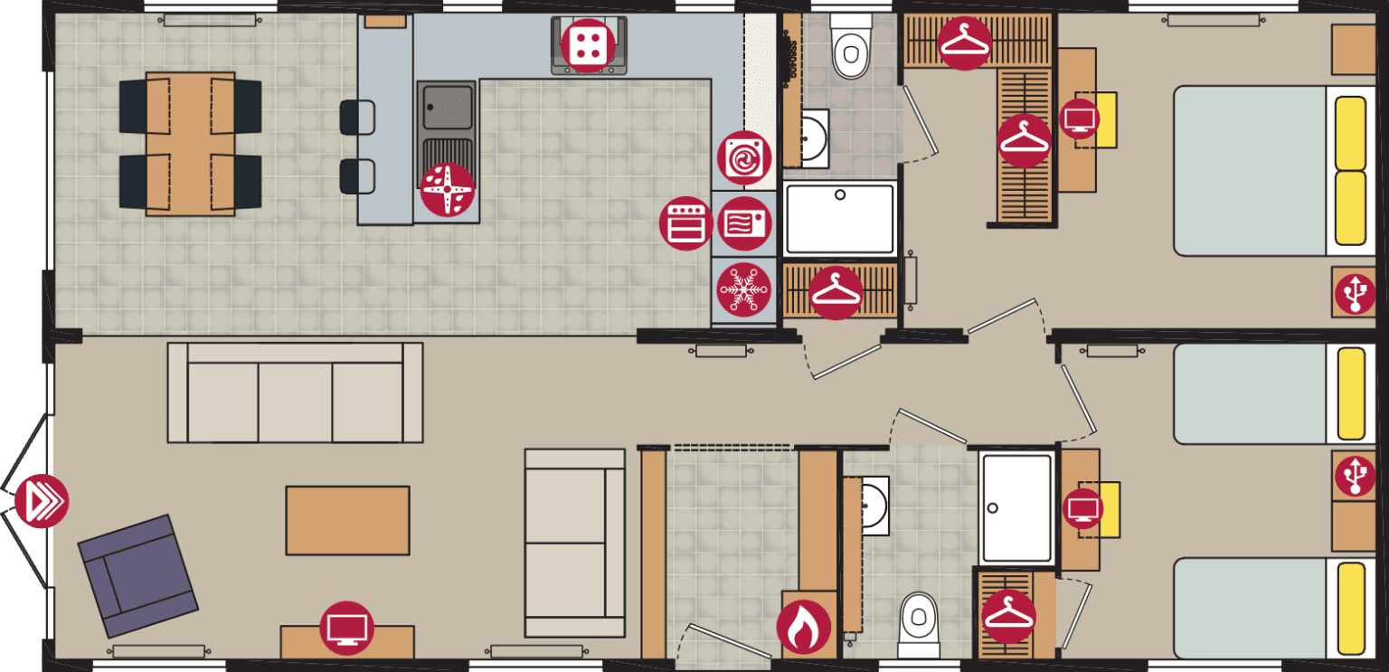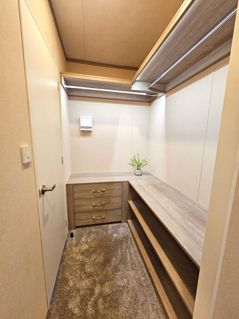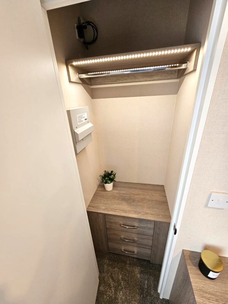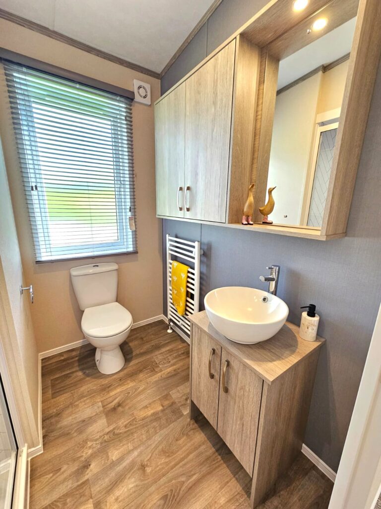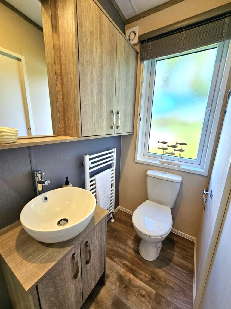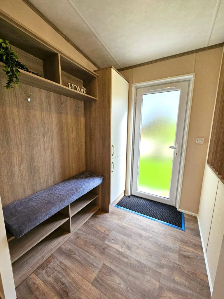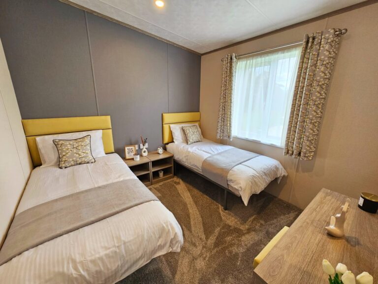 Pemberton Skydale Lodge NEW The Pemberton Skydale exudes character and charm, featuring an open-plan layout that facilitates a seamless flow between social spaces. Sleeps Size 40ft x 20ft Park Oakwood Valley Lodges Key features Open plan living spaceResidential specificationDouble glazed & central heatingIntegrated appliances - washer/dryer, microwave & dishwasherBreakfast bar with 2 stoolsWine coolerHive thermostatMaster bedroom with en-suite & walk-in wardrobeFully skirted and spacious front decking included Description The Pemberton Skydale exudes character and charm, featuring an open-plan layout that facilitates a seamless flow between social spaces. Upon entering the lodge, guests are greeted by a generous bench seat complemented by shelving and coat hooks, providing both functionality and style. The lounge area is furnished with a spacious freestanding three-seater sofa, a sofa bed, and an accent chair, all centred around a striking feature wall that houses an electric fireplace. A coffee table, designed to match the dining table, enhances the cohesive aesthetic of the space. The expansive U-shaped kitchen offers ample room for food preparation and storage, equipped with a five-burner gas hob, oven/grill, microwave, and fridge/freezer. Additional conveniences include an integrated dishwasher and washer/dryer. The stylish breakfast bar provides extra seating for guests, creating a casual dining option. Plinth lighting and under-cupboard spotlights contribute to a warm and inviting ambiance during the evenings. The dining area features a freestanding table that introduces an industrial style element, comfortably seating four. The spacious master king-sized bedroom is complete with a large vanity unit, bedside tables with overhead lighting, and an expansive walk-in wardrobe that includes hanging space, shelving, and drawers. The en-suite bathroom is equipped with a shower, WC, hand basin with under-sink storage, a mirror, a heated towel rail, and a storage cabinet. The twin bedroom is adorned with striking fabric headboards, bedside tables, a vanity unit, and a walk-in wardrobe featuring a set of drawers. The main bathroom offers a spacious shower, WC, hand basin with under-sink storage, a heated towel rail, a mirror, and a storage cabinet. The Skydale is enhanced by large front windows and French doors that invite an abundance of natural light, creating a bright and airy atmosphere. The French doors open onto a generous front decking area, allowing you to fully embrace your surroundings. Please note the skirting and decking is due for installation.
